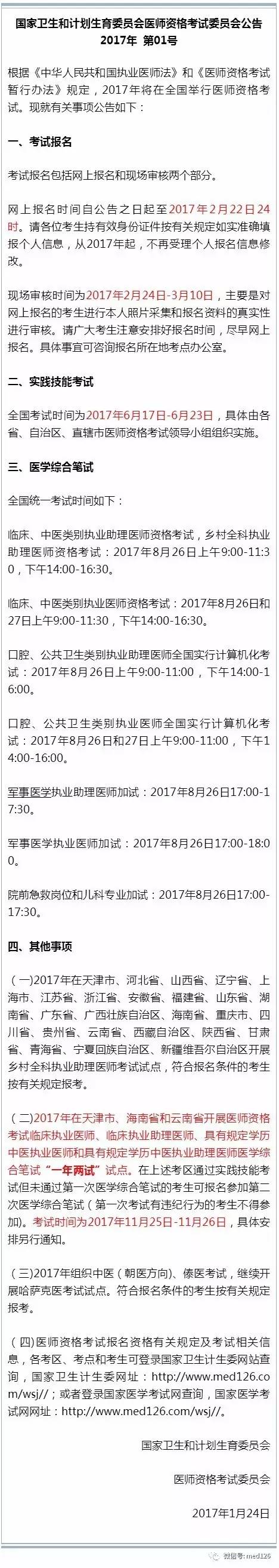 2017年2月4日,國(guó)家衛(wèi)生和計(jì)劃生育委員會(huì)醫(yī)師資格考試委員會(huì)公告,就2017年醫(yī)師資格考試就有關(guān)事項(xiàng)進(jìn)行了公告。