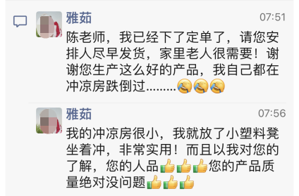 前段時(shí)間,蒙泰創(chuàng)始人、護(hù)士發(fā)明家、居家老人護(hù)理顧問(wèn)陳仁英每天都堅(jiān)持打卡有關(guān)防滑洗澡椅的朋友圈收到了一位老朋友雅茹姐姐的留言:“陳老師,我已經(jīng)下訂單買了您朋友圈發(fā)的防滑洗澡椅,家里的老人很需要。請(qǐng)您盡早安排發(fā)貨,謝謝。”陳仁英為雅茹姐姐的孝心點(diǎn)贊。