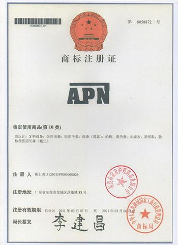 APN商標(biāo)注冊人為陳仁英小姐,專業(yè)從事醫(yī)療護理護師行業(yè)接近30年,其創(chuàng)始了東莞市蒙泰護理用品有限公司,主營磁控約束帶、靜態(tài)防壓瘡床墊、約束手套、老人椅、醫(yī)用約束帶、防牙齒體位墊系列、防足下垂護具、失禁用品、手術(shù)體位墊、骨科牽引系列等各種醫(yī)用用品。