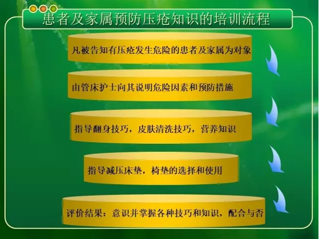 當(dāng)有壓瘡發(fā)生的風(fēng)險是,醫(yī)護人員應(yīng)對患者以及家屬進行壓瘡預(yù)防知識的培訓(xùn),具體如下圖,特別是翻身技巧與防壓瘡床墊的使用。