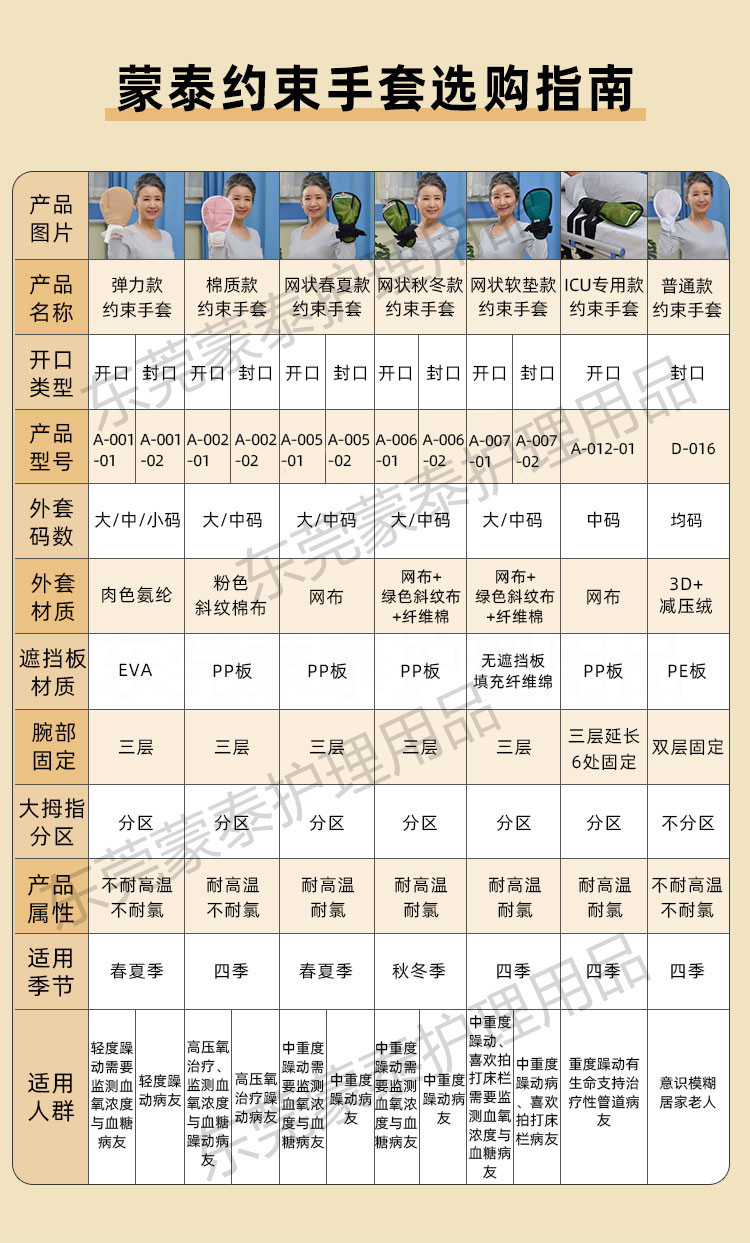 目前,蒙泰護(hù)理研發(fā)、生產(chǎn)、銷(xiāo)售多種款式的約束手套,可以應(yīng)用于不同的科室和使用場(chǎng)景,如有采購(gòu)、定制需求,歡迎聯(lián)系咨詢。