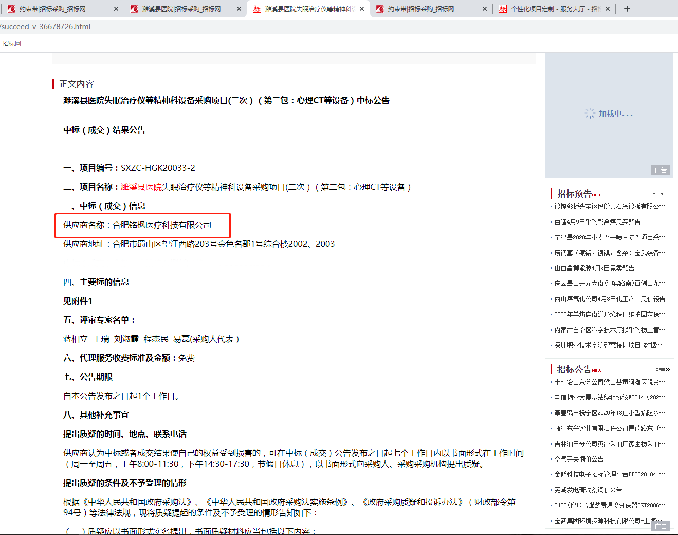 11月底開始第二次在公開網(wǎng)上招標(biāo),5位評(píng)審專家團(tuán)采用加分扣分制,經(jīng)多輪多方位綜合考慮,招標(biāo)結(jié)果是濉溪縣醫(yī)院失眠治療儀等精神科設(shè)備采購項(xiàng)目(二次)(第二包:心理CT等設(shè)備),由合肥銘楓醫(yī)療科技有限公司中標(biāo),磁控約束帶單元東莞蒙泰勝出。