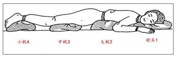 側(cè)臥時(shí)如圖示使用頭圈,頭枕,維持側(cè)臥30度的R型翻身枕,維持軀體俯側(cè)臥45度的三角枕燈。