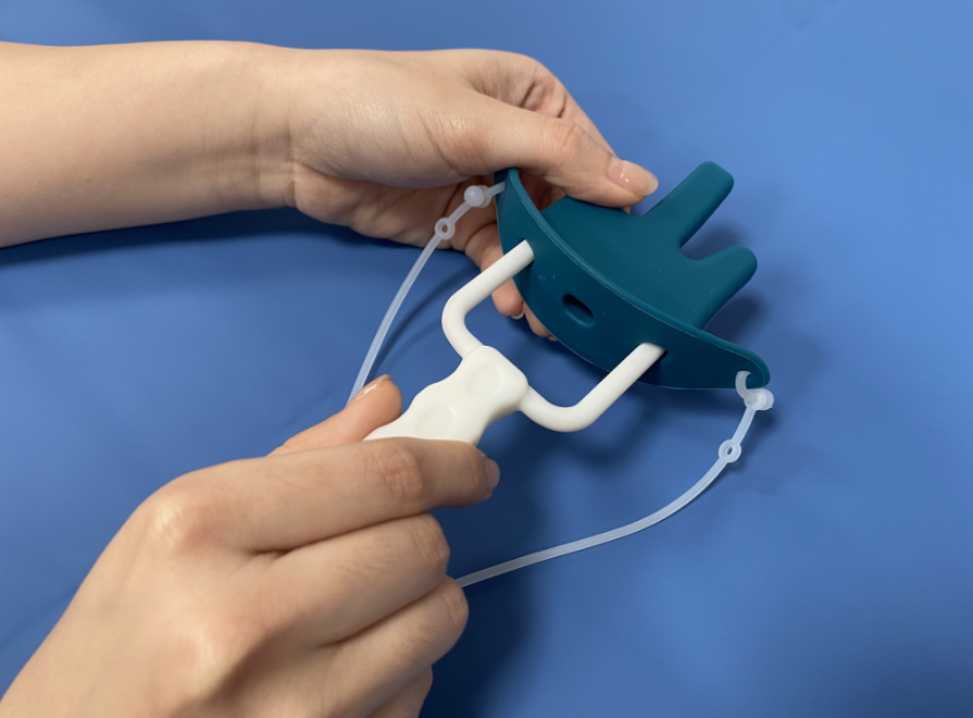 然后將彈力往后拉伸,套在患者后腦勺處,預(yù)防患者吐出壓舌器。