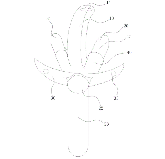 該裝置主要由壓舌器、撬牙器和彈力固定帶組成。壓舌器有硅膠材料開模制作,設(shè)有三個通道,敲牙器可通過通道插入和抽出,中間通道便于透氣和搶救時吸痰。