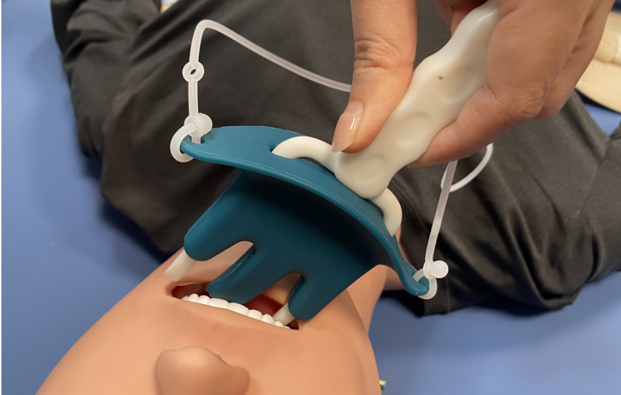 這項護士創(chuàng)新的防咬舌保護裝置既能撬開牙齒以便壓舌器塞入口中,又能有效固定壓舌器于口中,更加方便使用。同時,還設(shè)有通氣孔,方便患者通氣和搶救時吸痰。