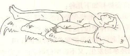 1、 在患者軀干前方及后方各置一軟枕,以保持軀干呈完全側(cè)臥位而非半腹臥位。
