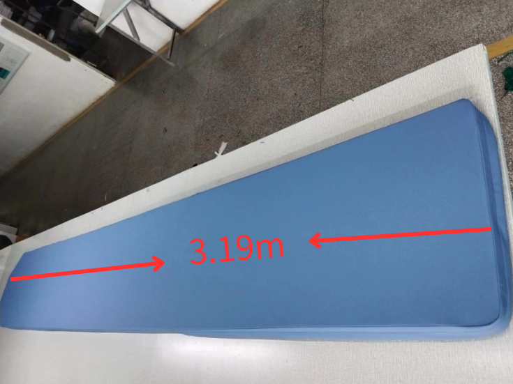 高總需要定制的超長款靜態(tài)防壓瘡床墊尺寸要求為:長3.19m,寬50cm,厚7cm,倒角15cm。同時(shí)還提出來一個(gè)顧慮:“液體會(huì)不會(huì)從外套車縫線位置會(huì)中滲入?”