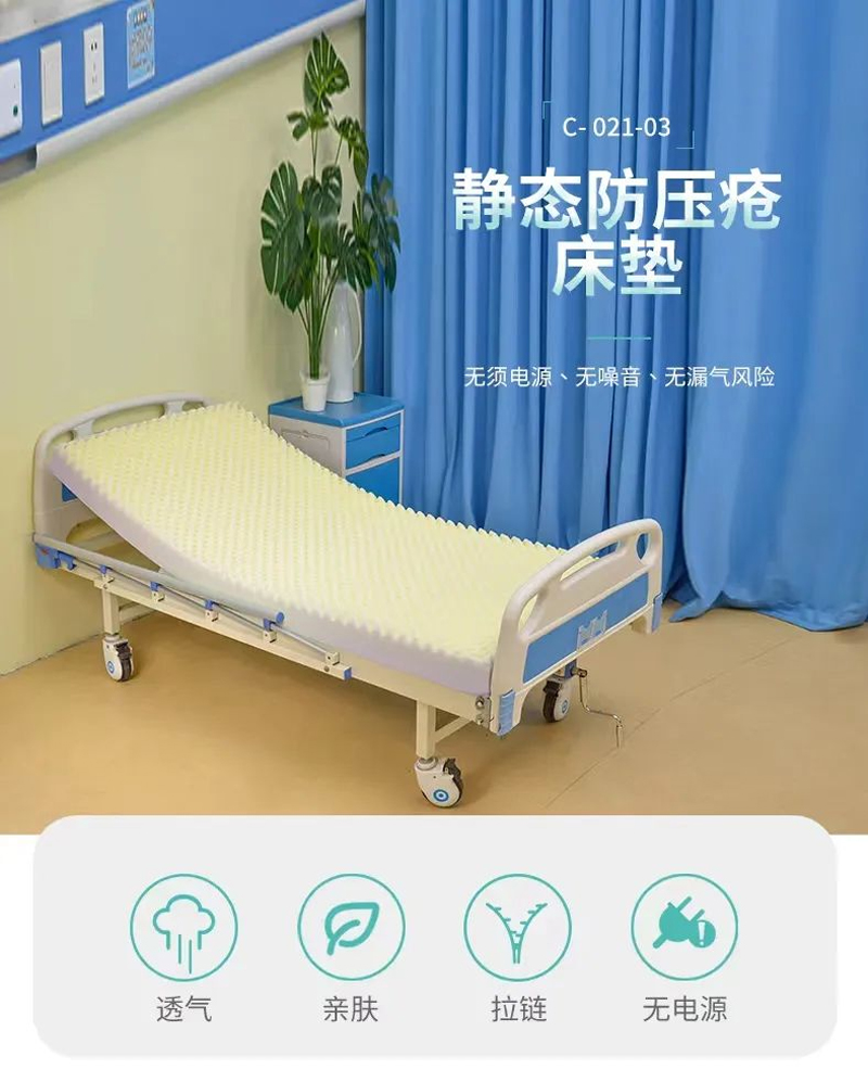 1、無(wú)噪音,舒適睡眠,可搖高調(diào)節(jié)不同體位,提高使用者的舒適性,能吸收壓力,外套防水透氣透濕,從減輕壓力、剪切力、摩擦力、潮濕四個(gè)壓瘡風(fēng)險(xiǎn)外源性因素來(lái)減少壓瘡發(fā)生的風(fēng)險(xiǎn)。
