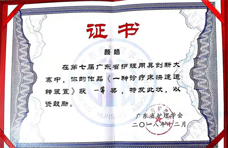 顏老師的專利作品獲得了2018年廣東省第七屆護理用品大賽一等獎,他非常用心做了樣品在自己科室用,得到了同事們的好評,已作為科室固定資產(chǎn)管理,但一直沒有推廣到市場!