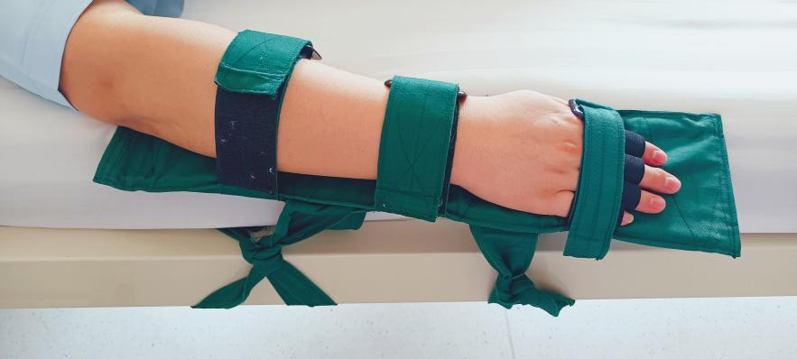 本產(chǎn)品主要采用醫(yī)用耐氯漂加厚綠色斜紋布、魔術貼、PE板、不銹鋼日字扣、松緊帶制作而成。實際應用場景當中,輸液固定板上的三道魔術貼起固定患者上肢,使之緊貼底部的PE板。手指位置,有設計專門的指環(huán)狀松緊帶,把手指固定在既定的位置,避免患者亂抓。輸液固定板底部設有綁帶,護理人員可以通過綁帶將輸液固定板和床架綁在一起,起到固定作用。這款產(chǎn)品可以說非常地貼切臨床實際需求。