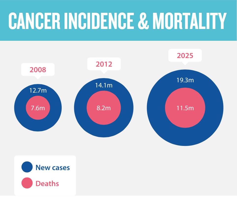 2012年全球有820萬人死于癌癥,其中400萬人過早地離開人世(30~69歲)。預計到2025年,會有1930萬新增癌癥患者,死亡1150萬?,F世界五大常見癌癥是:肺癌、乳腺癌、腸癌、前列腺癌和胃癌,通過對危險因素的了解,有近1/3的癌癥是可以預防的。因而,是時候在世界癌癥日反思你能做什么?發(fā)出你的聲音并采取行動,喚醒人們及媒體對癌癥的認識。