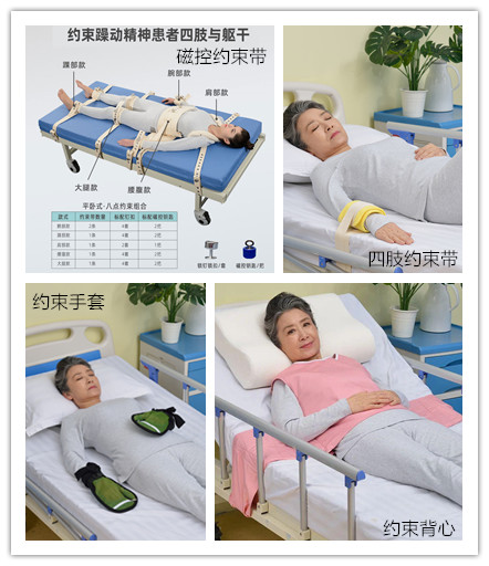 臨床上常采用磁控約束帶、四肢約束帶、約束手套、約束背心等將患者的手腕和踝、肩、膝等部位進(jìn)行約束后固定在病床或椅子上,限制其活動(dòng)能力和活動(dòng)范圍。