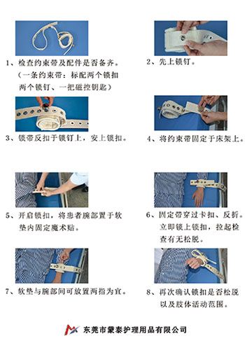 磁控約束帶是東莞蒙泰護(hù)理有限公司生產(chǎn)的一款專(zhuān)利產(chǎn)品(ZL 2014 2 0250586.2/ZL 2016 2 0227444.3),其使用操作方便簡(jiǎn)單,能快速控制約束患者。使用時(shí)無(wú)須打結(jié),有魔術(shù)貼,有卡扣,用磁控鎖裝置直接固定即可。為治療節(jié)省了時(shí)間。其(磁控約束帶)約束部位還采用保護(hù)墊,減輕了局部壓力和摩擦力,對(duì)患者約束部位也起到了保護(hù)性。