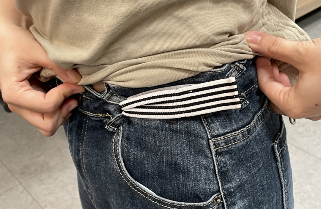 精神科患者在入院時(shí),為確保病人在住院期間的安全性,必須接受入院前的安全檢查,不能佩用自己的長腰帶。傳統(tǒng)替代方法是將兩條短褲帶穿過褲袢相互打活結(jié)使用。雖然取材方便,但松緊度不好把握,病人常將短褲帶丟失或打成死結(jié),不僅增加了護(hù)理工作量,而且還存在安全隱患。