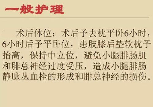 一般性護(hù)理包括兩個(gè)方面:1為觀察,患者發(fā)現(xiàn)有任何不適或者皮膚表面有不同癥都應(yīng)匯報(bào)給醫(yī)生。2為體位護(hù)理,術(shù)后平躺6小時(shí)后要用臥位,并予以抬高體位。