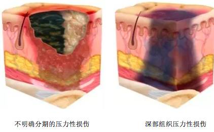 皮膚局部出現(xiàn)持久性非蒼白性發(fā)紅、褐紅色或紫色,或表皮分離后出現(xiàn)暗紅色傷口床或充血性水皰,顏色發(fā)生改變前往往會有疼痛和溫度變化;在骨隆突處強烈的壓力和(或)持續(xù)的壓力和剪切力會致使該損傷的出現(xiàn)。