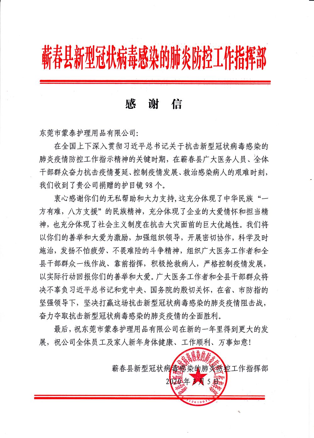 2月20日,第一批隔離衣成功出廠送給篁村社區(qū)為社區(qū)的防控疫情工作出一份力;3月4日,500件醫(yī)用隔離衣送到東莞市紅十字會,用于支援東莞醫(yī)護(hù)人員的抗疫工作;3月5日,向佛山援鄂醫(yī)療隊(duì)捐贈了專利轉(zhuǎn)化護(hù)理用具,用于保障新冠肺炎確診患者的安全護(hù)理和康復(fù),減輕醫(yī)護(hù)人員的工作壓力。在這之前蒙泰還購買口罩2000個捐贈給山西精神衛(wèi)生中心,護(hù)目鏡98個捐贈湖北薊春紅十字會,并收貨感謝信。