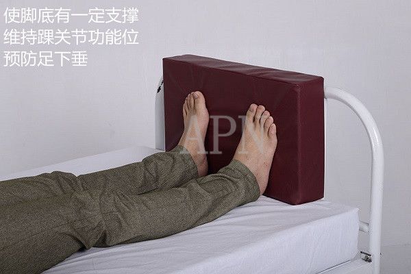3、截癱、腓總神經(jīng)損傷、足部不能背伸的患者臥床休息時(shí)保持足中立位。踝關(guān)節(jié)背伸90度。在足部墊軟枕,避免足部懸空。