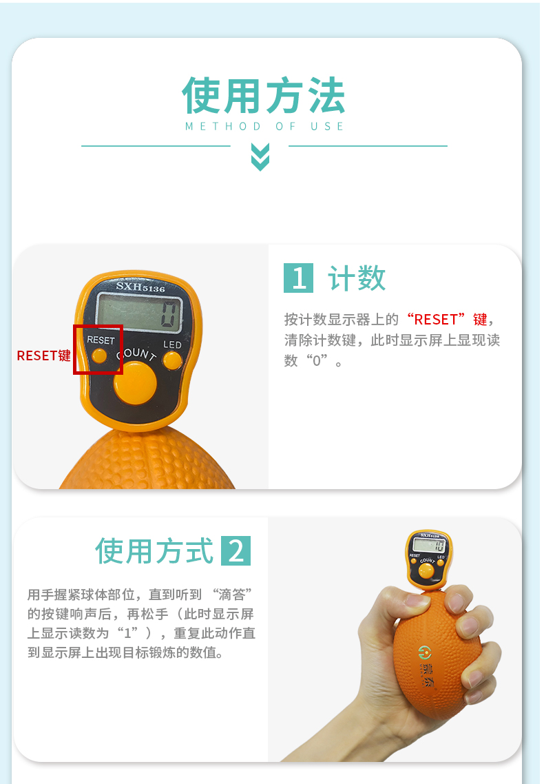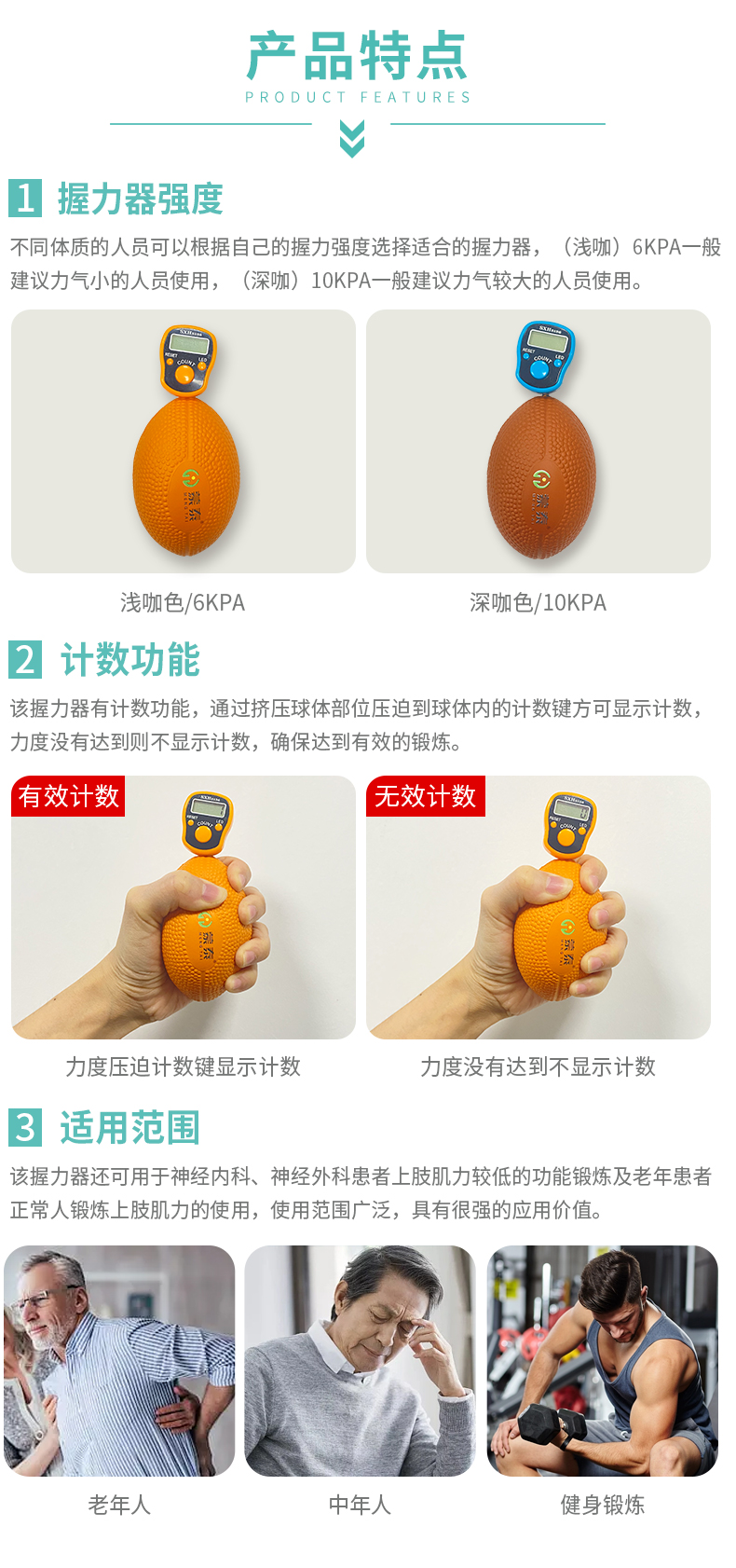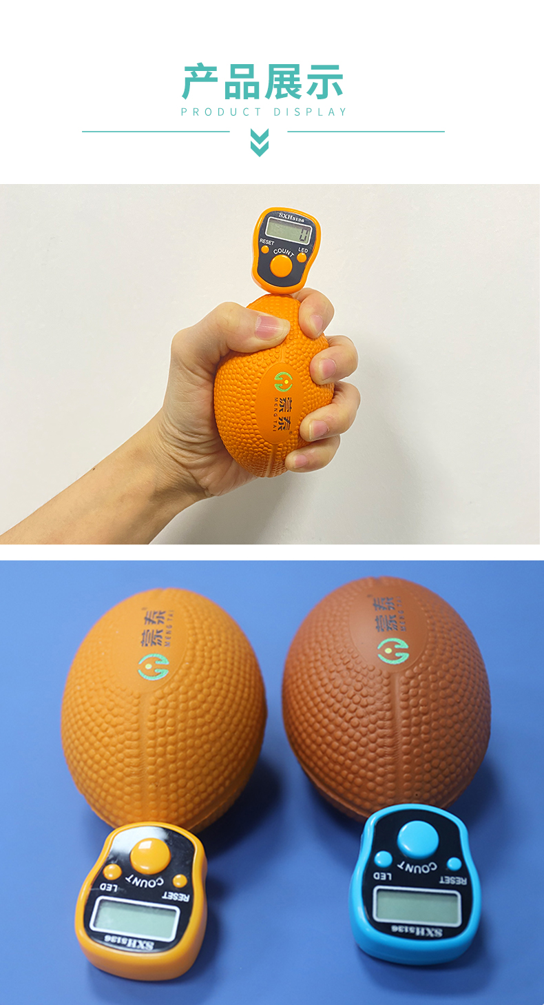 2、次握力器有計數(shù)功能,通過擠壓球體部位壓迫到球體內(nèi)的計數(shù)鍵方可顯示計數(shù),力度沒有達到則不顯示計數(shù),確保達到有效的鍛煉。