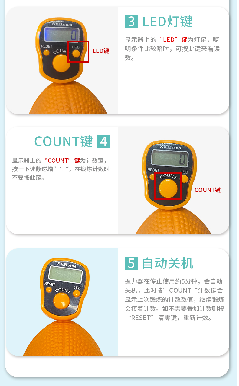 5、握力器在停止使用約5分鐘,會自動關(guān)機,此時按”COUNT“鍵會顯示上次鍛煉的計數(shù)數(shù)值,繼續(xù)鍛煉會接著計數(shù)。如不需要疊加計數(shù)則按”RESET”鍵清零,重新計數(shù)。