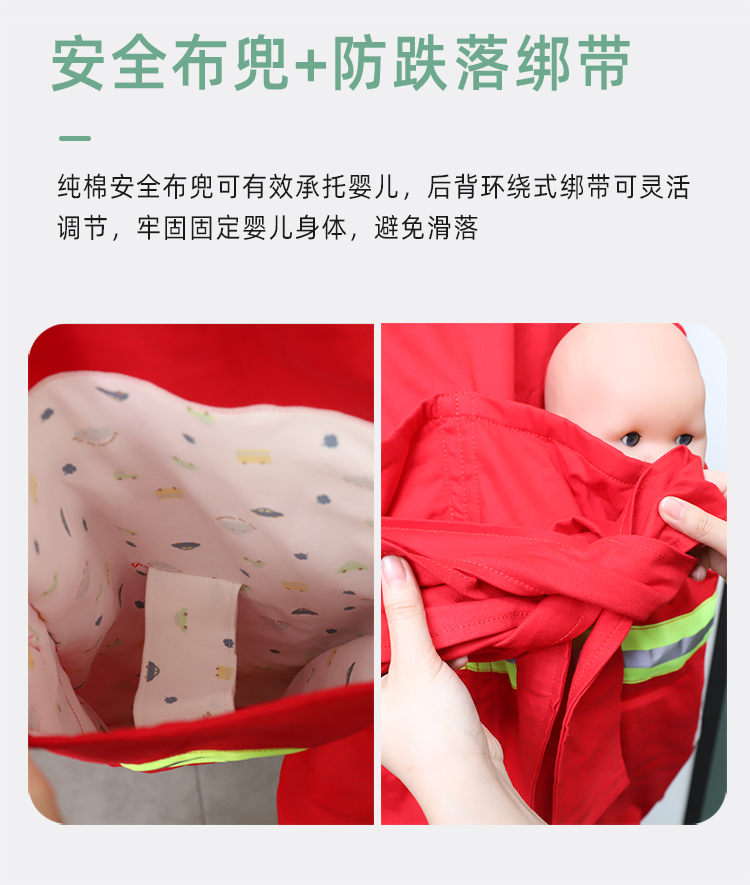 純棉安全布兜可有效承托嬰兒,后背環(huán)繞式綁帶可靈活調(diào)節(jié),牢固固定嬰兒身體,避免滑落。