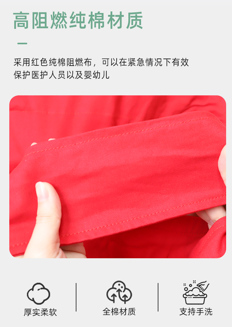 采用紅色純棉阻燃布,可以在緊急情況下有效保護(hù)醫(yī)護(hù)人員以及嬰幼兒。