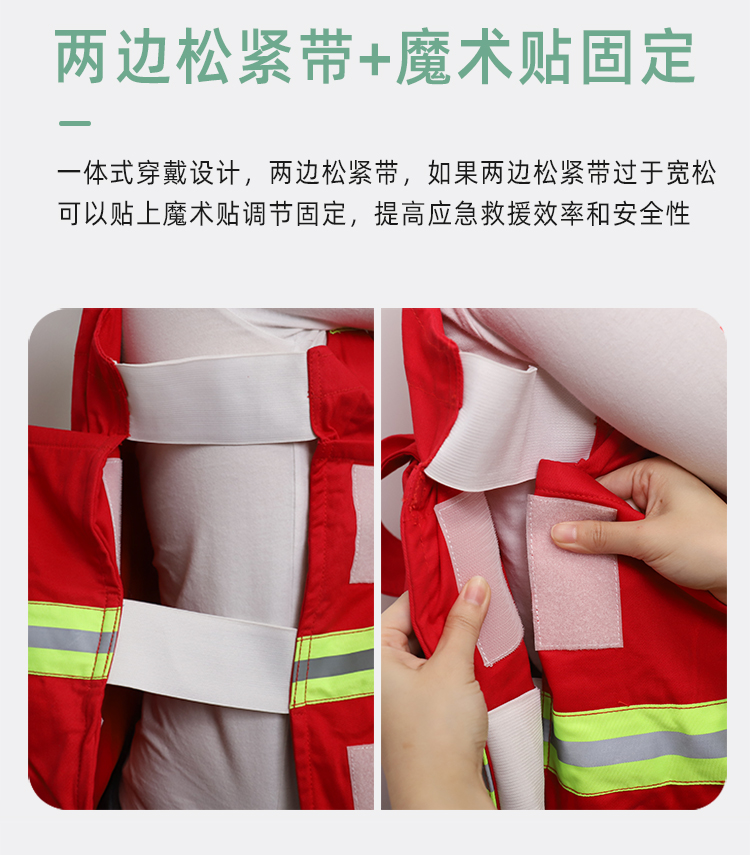 一體式穿戴設(shè)計(jì),兩邊松緊帶,如果兩邊松緊帶過(guò)于寬松,可以貼上魔術(shù)貼調(diào)節(jié)固定,提高應(yīng)急救援效率和安全。