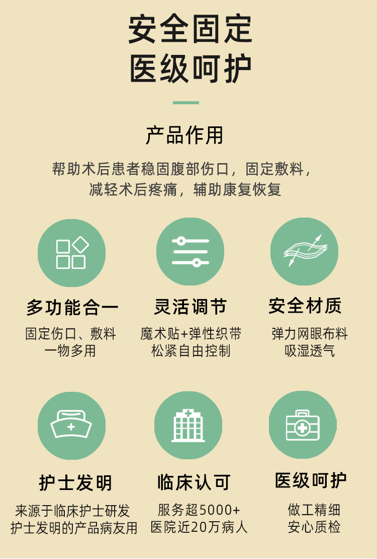 產(chǎn)品作用:幫助術(shù)后患者穩(wěn)固腹部傷口,固定敷料減輕術(shù)后疼痛,輔助康復(fù)恢復(fù)